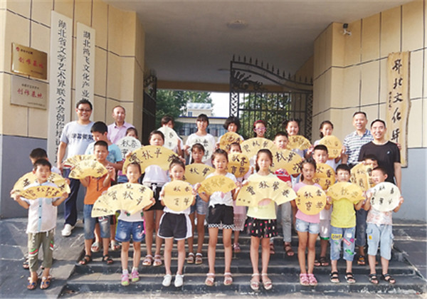 湖北省文聯在駐點扶貧村建設的“鄂北文化驛站”培訓留守兒童書法