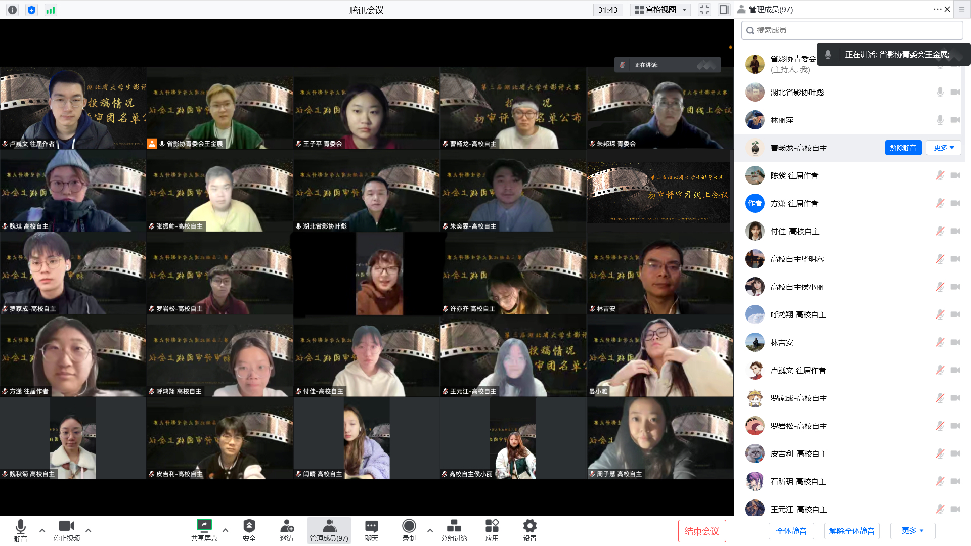 12月4日,第三屆湖北省大學(xué)生影評大賽線上評審團(tuán)會議成功召開。湖北省電影家協(xié)會秘書處、湖北省電影家協(xié)會青年電影工作委員會相關(guān)人員、初審評審團(tuán)本科生組和研究生組指導(dǎo)老師以及108位初審評審團(tuán)成員參加本次線上會議。