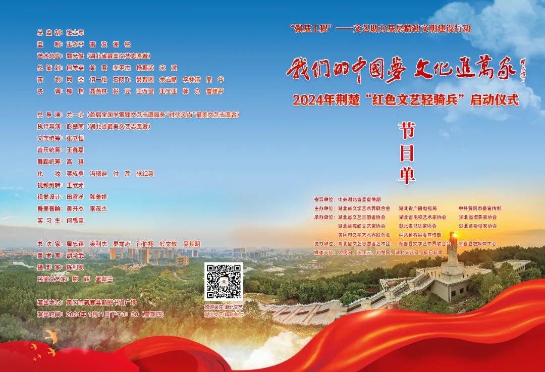重振旗鼓聚蘄春,意氣風發啟新程。1月11日,2024年“我們的中國夢 文化進萬家”荊楚“紅色文藝輕騎兵”啟動儀式在黃岡市蘄春縣新圖書館廣場盛大舉辦。省文聯主席楊俊,省委宣傳部文藝處副處長張龍,省文聯黨組成員、副主席王永平,省廣電局黨組成員、副局長謝銘,省文聯二級巡視員雷波,省文聯副主席徐寧,黃岡市委宣傳部副部長吳敬秋,黃岡市文聯主席秦龍志,蘄春縣委常委、宣傳部部長楊振武與蘄春縣各界模范代表以及3000余名當地群眾,現場觀看演出。本次活動通過央視頻、荊楚網、壟上頻道、云上蘄春等媒體,全省“村村響”10個市級平臺、92個縣級平臺、25720個村級廣播系統、30多萬只音柱和喇叭終端同步播出,實現了向全省農村地區同步宣講發聲,36萬余名線上觀眾共享文藝盛宴。