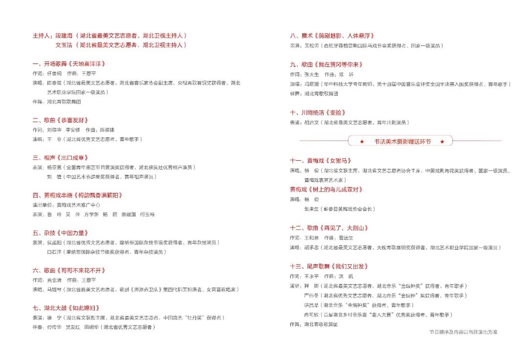 本場活動在湖北省最美文藝志愿者、湖北省音協副主席、央視青歌賽銀獎獲得者陳春茸帶來的歌舞《天地喜洋洋》中拉開序幕。隨后由省內知名藝術家王菲、楊亞男、劉雄、侯孟陽、白石洋、吳松濤、胡啟文帶來的歌曲《恭喜發財》、相聲《出口成章》、雜技《中國力量》、魔術《鴿劇魅影、人體懸浮》、川劇絕活《變臉》等精彩節目無不讓人大飽眼福,拍手叫好。本場活動由湖北廣播電視臺首席導演、省電視藝術家協會駐會副主席兼秘書長郭光俊擔任藝術總監,湖北省文藝志愿者藝術團團長尤一心執導,湖北省最美文藝志愿者、湖北衛視節目主持人段建海、文玉潔聯袂主持,湖北青歌歌舞團伴舞。