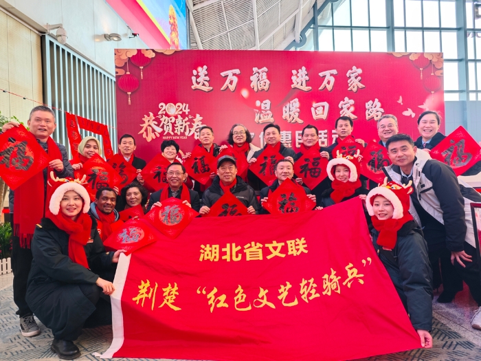 1月27日,在新春佳節(jié)來臨之際。“送萬福進(jìn)萬家 溫暖回家路”湖北省文聯(lián)荊楚“紅色文藝輕騎兵”文藝惠民系列活動(dòng)在武漢市漢口站、武漢站、武昌站火熱開展,省文聯(lián)黨組成員、副主席王永平,省文聯(lián)黨組成員、秘書長張海旺,中國鐵路武漢局宣傳部副部長曾連平出席此次活動(dòng)。