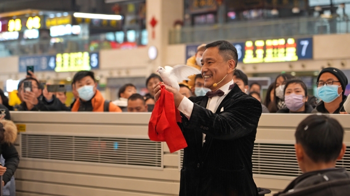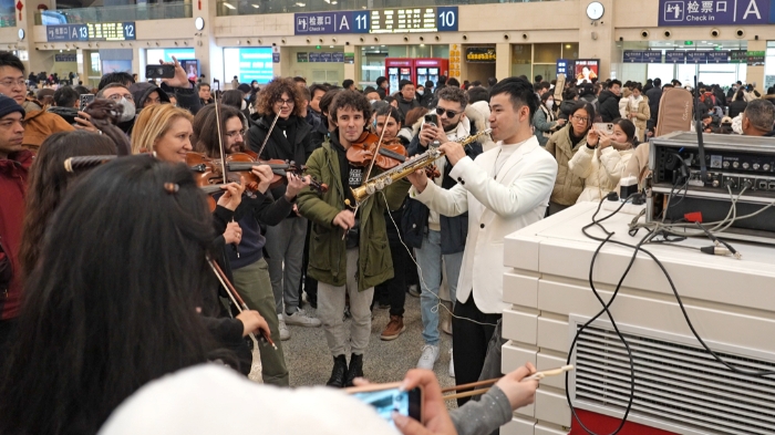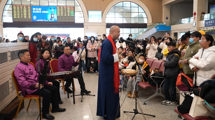 本次活動(dòng)還在漢口火車站開展了一場別開生面的文藝惠民演出,特邀省內(nèi)知名藝術(shù)家徐寧、朱睿淇、蔡鑫、劉琴、吳松濤、胡啟文為漢口站的廣大旅客們帶來湖北大鼓、器樂合奏、魔術(shù)、川劇變臉等精彩節(jié)目。活動(dòng)現(xiàn)場人聲鼎沸氣氛非常熱烈,旅客們或坐位子或坐行李或坐地上,叫好聲、歡呼聲如浪潮般翻涌,藝術(shù)家們也紛紛走下舞臺(tái),與現(xiàn)場觀眾互動(dòng),神秘莫測的魔術(shù)、變臉最受孩子們的歡迎,地道幽默的湖北大鼓讓不少歸鄉(xiāng)旅客笑中有淚。演出籌備期間,正在調(diào)試樂器的藝術(shù)家們還吸引了一支特別的隊(duì)伍,這支來自意大利的科莫湖畔交響樂隊(duì)被現(xiàn)場濃厚的中國傳統(tǒng)文化氛圍所感染,熱切地表示想要加入合奏,一首《友誼天長地久》和《茉莉花》收獲了大量的贊揚(yáng)與掌聲,音樂無國界,這場別開生面的器樂合奏用音樂的語言進(jìn)行著中外文化交流。