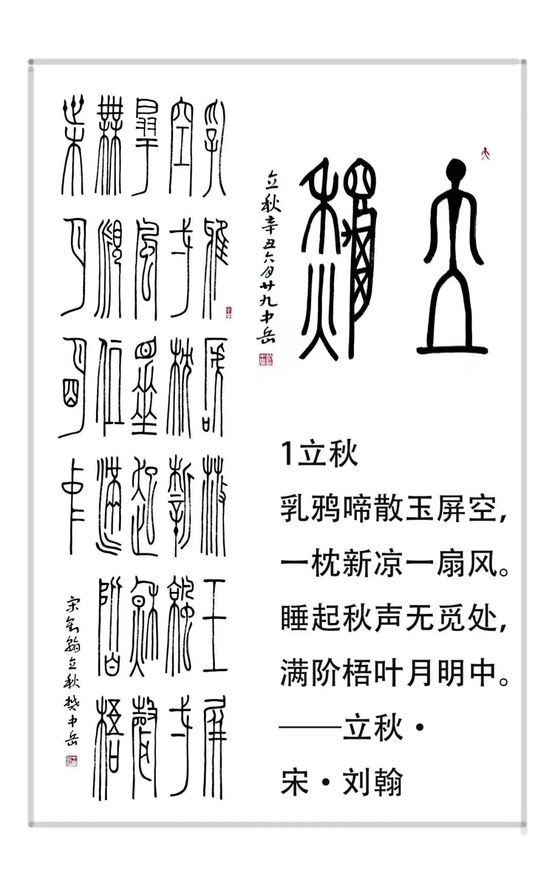 展覽共分三個主要版塊:其一“孝行天下 福滿人間”,以楚金文和章草兩種形式書寫《二十四孝》作品25件,篆刻印章24方。同時,還展示部分關于二十四孝的實物,通過書法作品等形式倡導孝道;其二“知來明去 文化傳承”,展出以二十四節氣詩為主題的楚金文作品24件,臨《蔡侯申盤銘文》四條屏1件,體現了作者追求蔡侯申意趣的楚金文作品風格及高度;其三“眾妙攸歸 墨彩凝眸”,展出作者近年篆書、章草、篆刻作品30余件。其中古文字合文、十二生肖圖形文字及拓片題跋是作者學習研究后創作的作品,已有一定的研究成果。