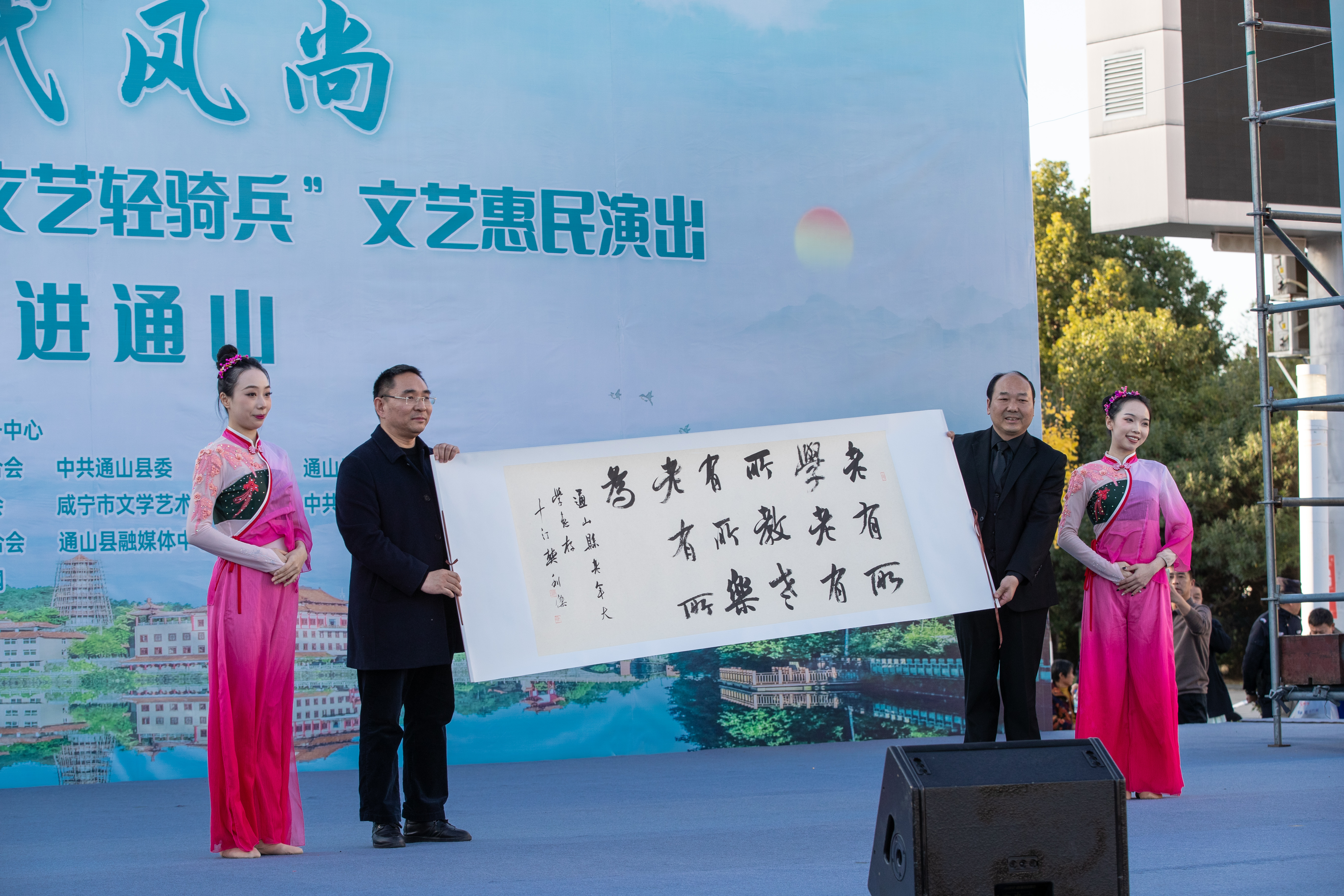 演出當天,通山暖陽高照,廣場人頭攢動,氣氛熱烈。舞臺布置簡潔大氣,音響效果極佳,為演出的順利進行提供了有力的保障。主辦方還特意設置了猜謎環節和書法攝影作品贈送環節,中國書協行書委員會委員、湖北省書協副主席、湖北省書法院副院長、中國書法蘭亭獎獲得者樊利杰現場為通山縣贈送書法作品。增加了觀眾的互動性和參與感,使整個活動更加生動有趣。