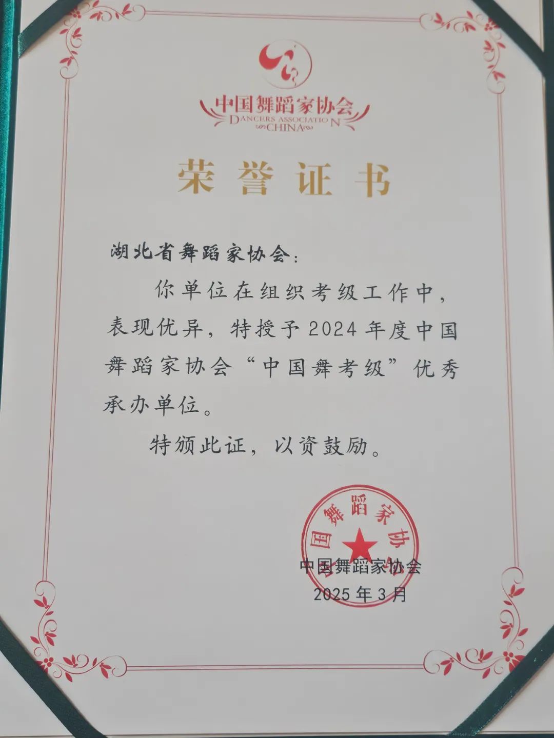 3月29日—4月3日,2025年中國舞蹈家協(xié)會(huì)全國考級(jí)工作會(huì)暨“中國舞考級(jí)”承辦單位負(fù)責(zé)人培訓(xùn)班在重慶市舉辦。會(huì)上,湖北省舞協(xié)因在組織考級(jí)工作中表現(xiàn)優(yōu)異,被授予2024年度中國舞蹈家協(xié)會(huì)“中國舞考級(jí)”優(yōu)秀承辦單位榮譽(yù)稱號(hào)。