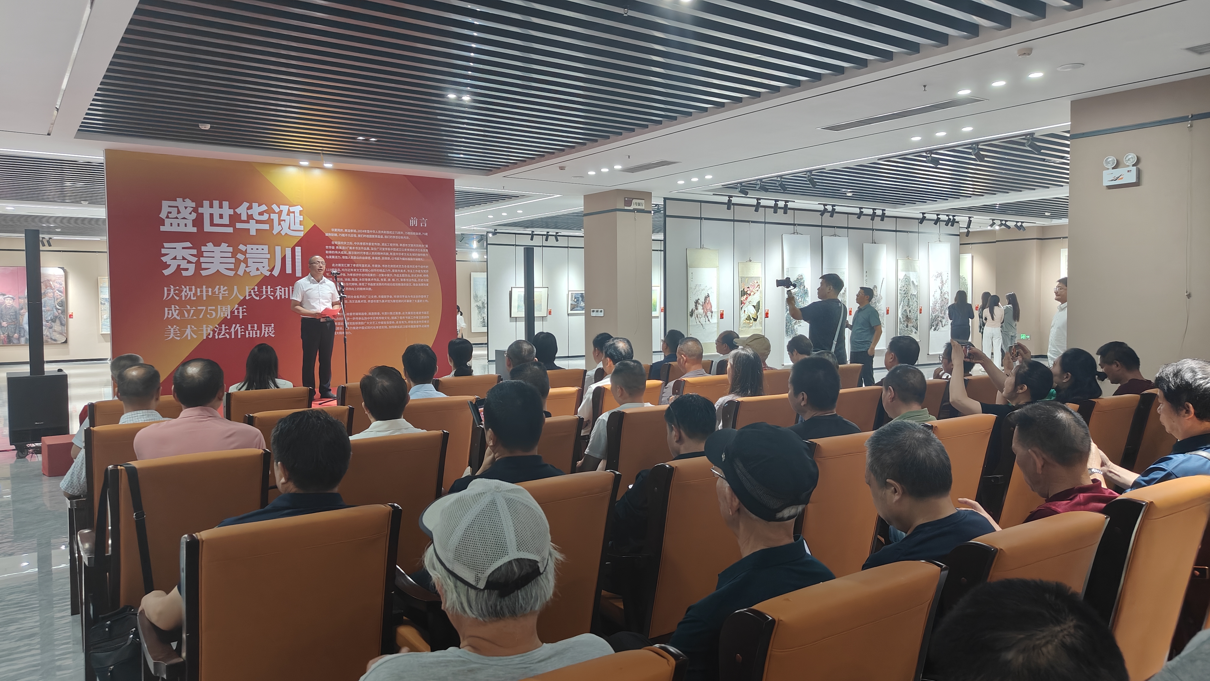 9月26日,“盛世華誕 秀美澴川”慶祝中華人民共和國成立75周年美術書法作品展在湯文選美術館開幕,孝感市政協副主席于斌出席活動并宣布展覽開幕。攝影:張翠蘋