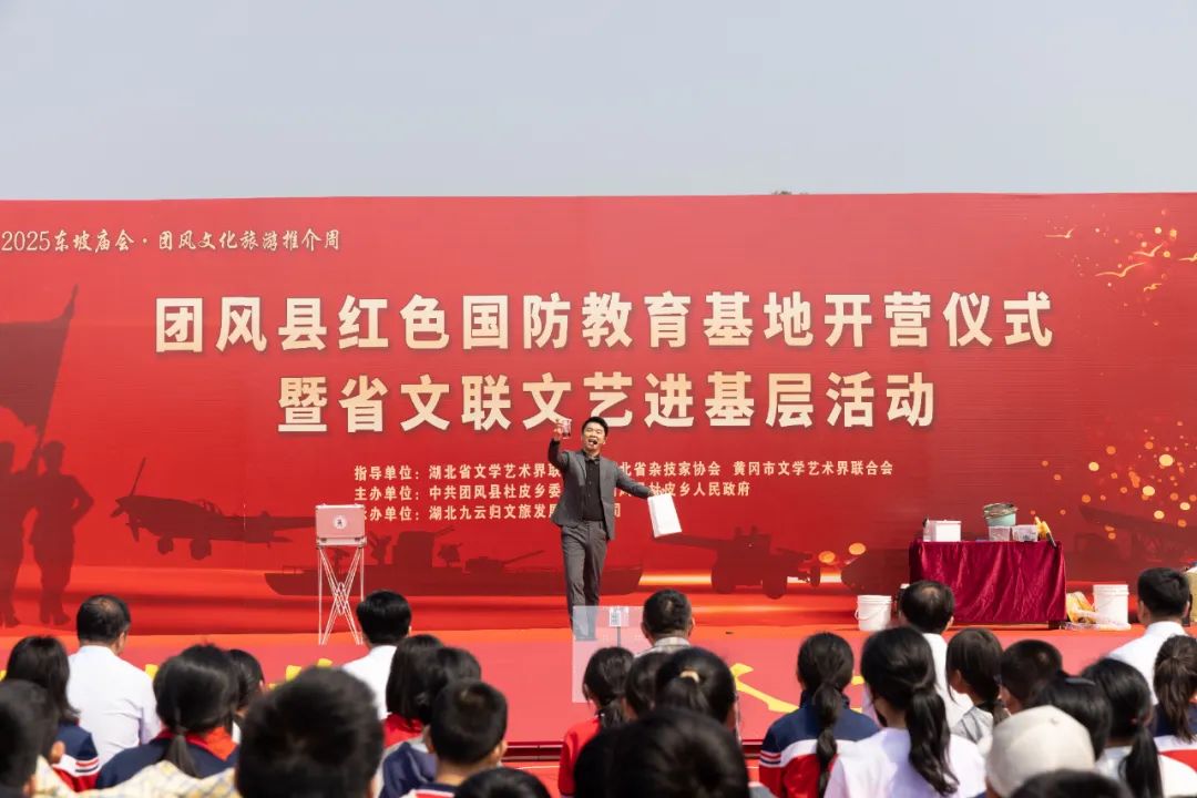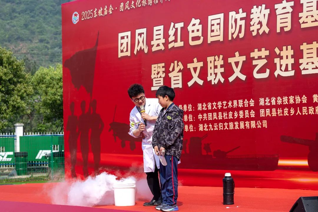 4月28日,2025年“科學魔術秀”輔導小分隊活動在團風縣杜皮中學國防教育基地成功舉辦。省雜技家協會駐會副主席、秘書長李甲杰,黃岡市文聯黨組書記、主席葉大軍,以及團風縣相關部門領導和500余名師生參加本次活動。