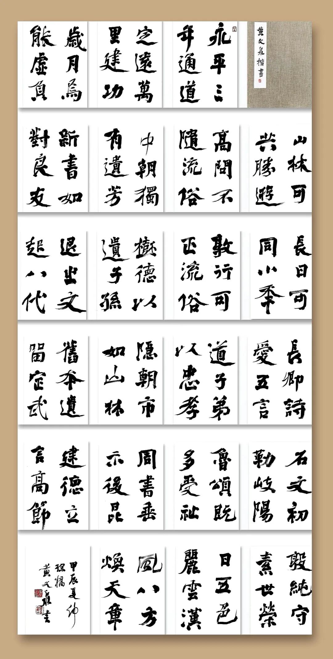 從結(jié)構(gòu)上看,黃文泉通過大量臨習(xí)褚遂良的《大字陰符經(jīng)》等經(jīng)典作品,努力攻克結(jié)構(gòu)方面的難題。他的楷書結(jié)構(gòu)嚴(yán)謹(jǐn)、疏密得當(dāng),各部分之間相互呼應(yīng)、協(xié)調(diào)統(tǒng)一。同時(shí),他又大膽創(chuàng)新,將行草的用筆融入楷書,打破了傳統(tǒng)楷書結(jié)構(gòu)的呆板,使其更具靈動(dòng)性和變化性。他的字時(shí)而舒展大氣,時(shí)而緊湊內(nèi)斂,給人一種跌宕起伏的視覺感受。