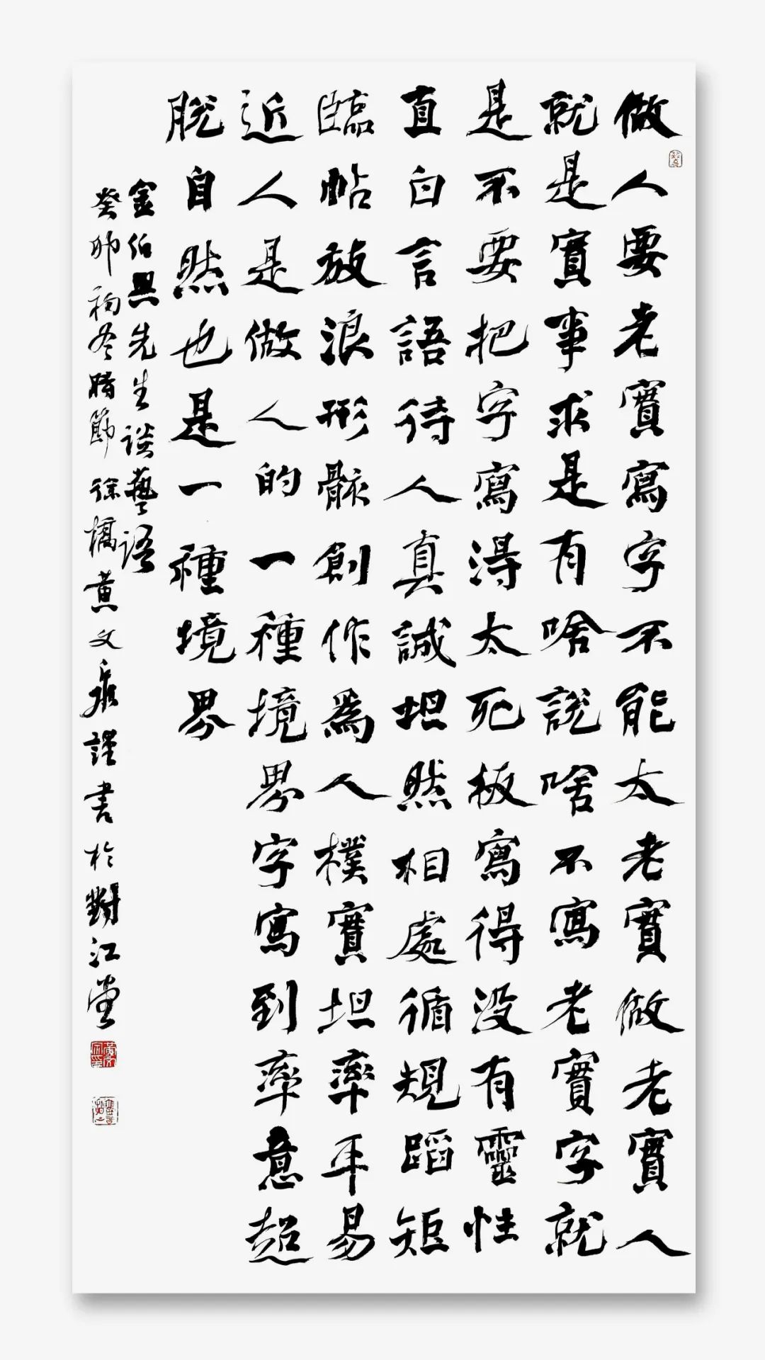 黃文泉以王國維的“三種境界”為參照,結(jié)合自己長(zhǎng)期的楷書創(chuàng)作經(jīng)驗(yàn),總結(jié)出了作楷的三種境界。第一境是“亦步亦趨,戰(zhàn)戰(zhàn)兢兢,如臨深淵,如履薄冰”,這一階段的書法學(xué)習(xí)者處于對(duì)書法規(guī)則和技巧的摸索階段,需要小心翼翼地模仿和學(xué)習(xí)古人的經(jīng)典作品,努力掌握基本的筆法、結(jié)構(gòu)和章法。這是書法學(xué)習(xí)的基礎(chǔ)階段,只有通過扎實(shí)的基礎(chǔ)訓(xùn)練,才能為后續(xù)的發(fā)展打下堅(jiān)實(shí)的基礎(chǔ)。第二境是“端莊平和,沉著冷靜,氣骨開張,頗具匠心”,在這個(gè)階段,書法創(chuàng)作者已經(jīng)熟練掌握了書法的基本技巧,能夠在遵循傳統(tǒng)的基礎(chǔ)上,展現(xiàn)出自己的風(fēng)格和特色,作品開始具有一定的個(gè)性和藝術(shù)感染力。而第三境則是“心閑意淡,悠游自在,無所縈懷,逍遙‘法’外”,這是一種超越了傳統(tǒng)法度束縛的境界,書法創(chuàng)作者能夠?qū)⒆约旱那楦泻蛡€(gè)性充分融入到作品中,達(dá)到一種隨心所欲而不逾矩的境界。在這個(gè)境界中,書法不再是一種單純的技藝,而是一種表達(dá)自我、抒發(fā)情感的藝術(shù)方式。