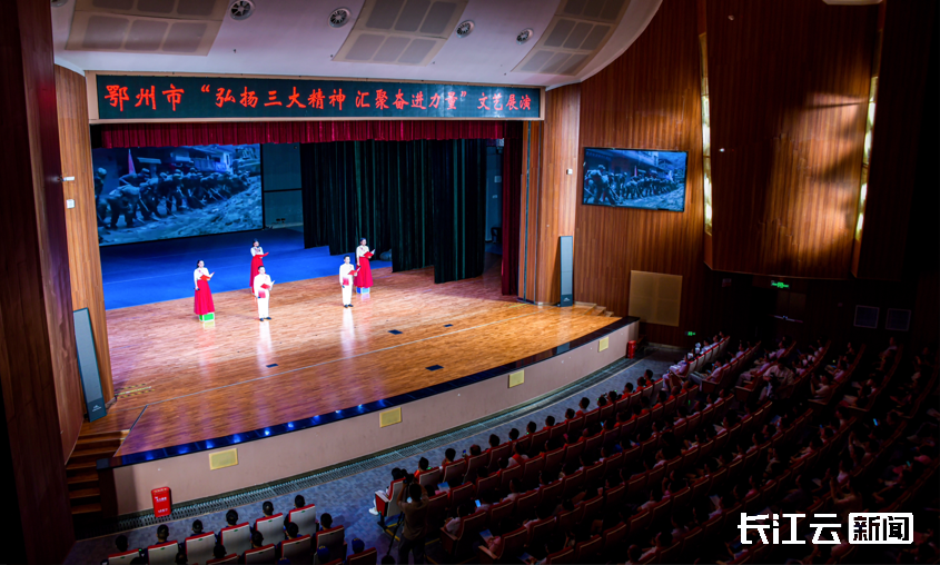 6月19日,“弘揚三大精神 匯聚奮進力量”文藝展演在鄂州大劇院璀璨啟幕。本次活動通過歌舞、戲劇、朗誦等多種藝術形式,生動詮釋了“三大精神”的深刻內涵。來自鄂州市的醫護人員、消防隊員、退役軍人、勞動模范、道德楷模等群體代表近千人共同聆聽了一場“三大精神”文藝“大思政課”。