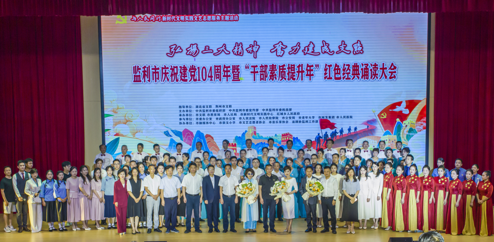 為深入學(xué)習(xí)貫徹習(xí)近平新時(shí)代中國(guó)特色社會(huì)主義思想和黨的二十大、二十屆二中三中全會(huì)精神,深入踐行習(xí)近平文化思想,落實(shí)全省“干部素質(zhì)提升年”工作部署,近日,監(jiān)利市成功舉辦“弘揚(yáng)三大精神,奮力建成支點(diǎn),慶祝建黨104周年暨干部素質(zhì)提升年”紅色經(jīng)典誦讀大會(huì)。湖北省文聯(lián)二級(jí)巡視員張海旺,荊州市文聯(lián)黨組成員、副主席謝葵,監(jiān)利市委副書記、市長(zhǎng)聶良平等領(lǐng)導(dǎo)和監(jiān)利市社會(huì)各界代表共計(jì)700余人參加。