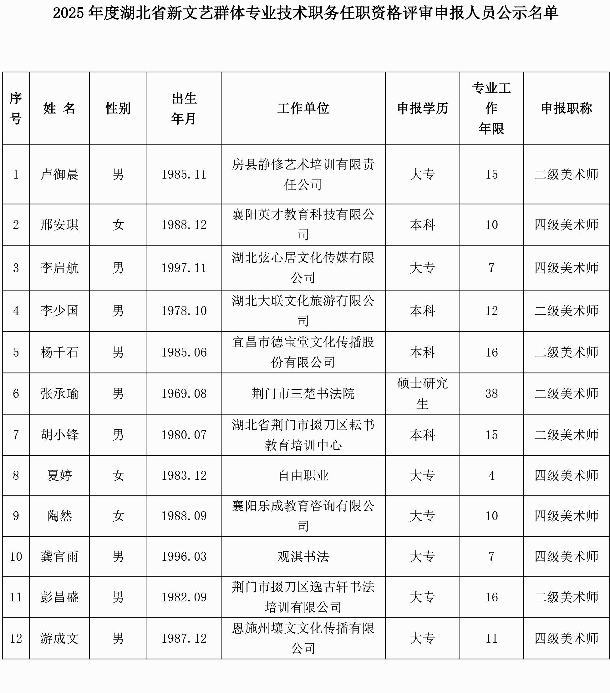 省書協|2025年度湖北省新文藝群體專業技術職務任職資格評審申報人員名單公示公告
