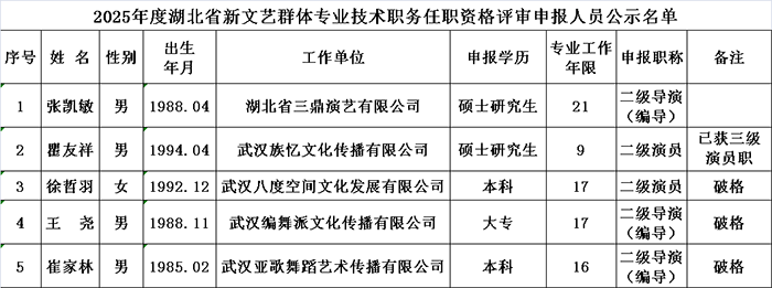 附件:2025年度湖北省新文藝群體專業技術職務任職資格評審申報人員公示名單