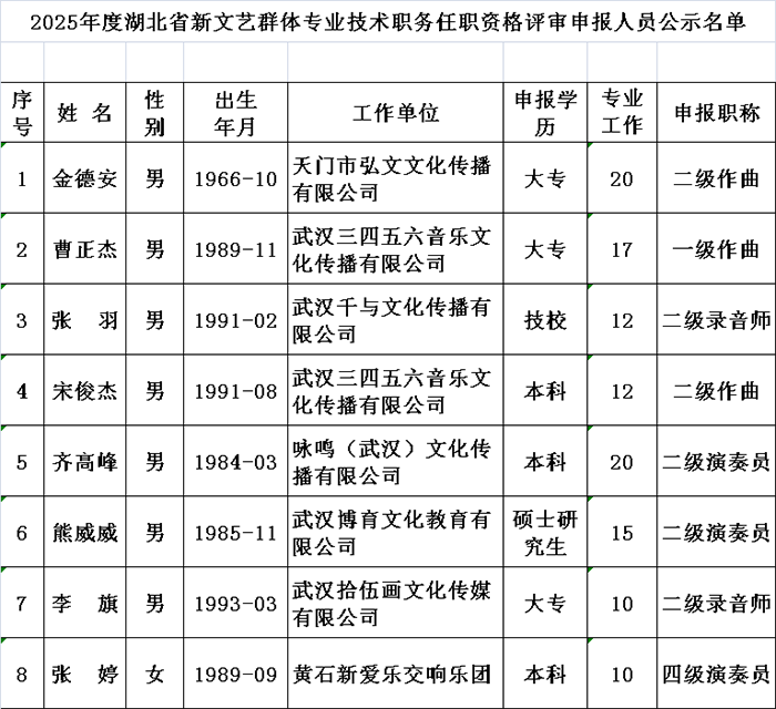 附件:2025年度湖北省新文藝群體專業技術職務任職資格評審申報人員公示名單